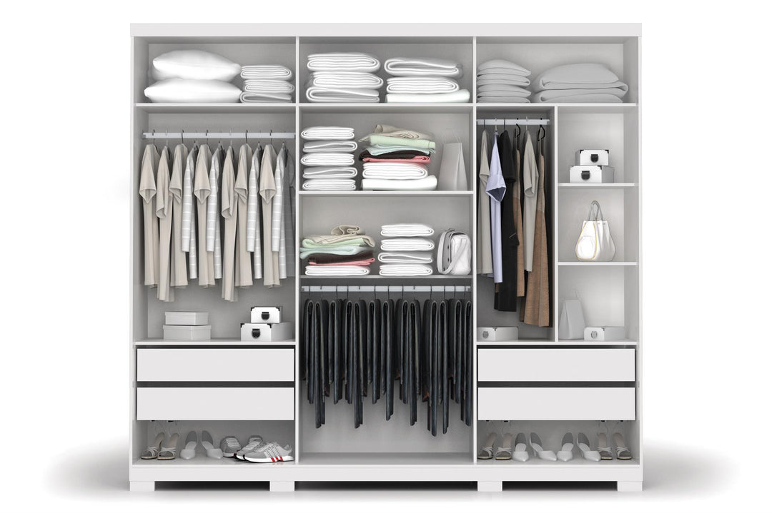 The Leanardo Wardrobe combines sleek modern design with refined functionality, making it a standout addition to any bedroom. Its three sliding doors, including a full-length mirror, glide effortlessly to reveal a spacious interior with ample hanging space and shelving for garments, accessories, and essentials.